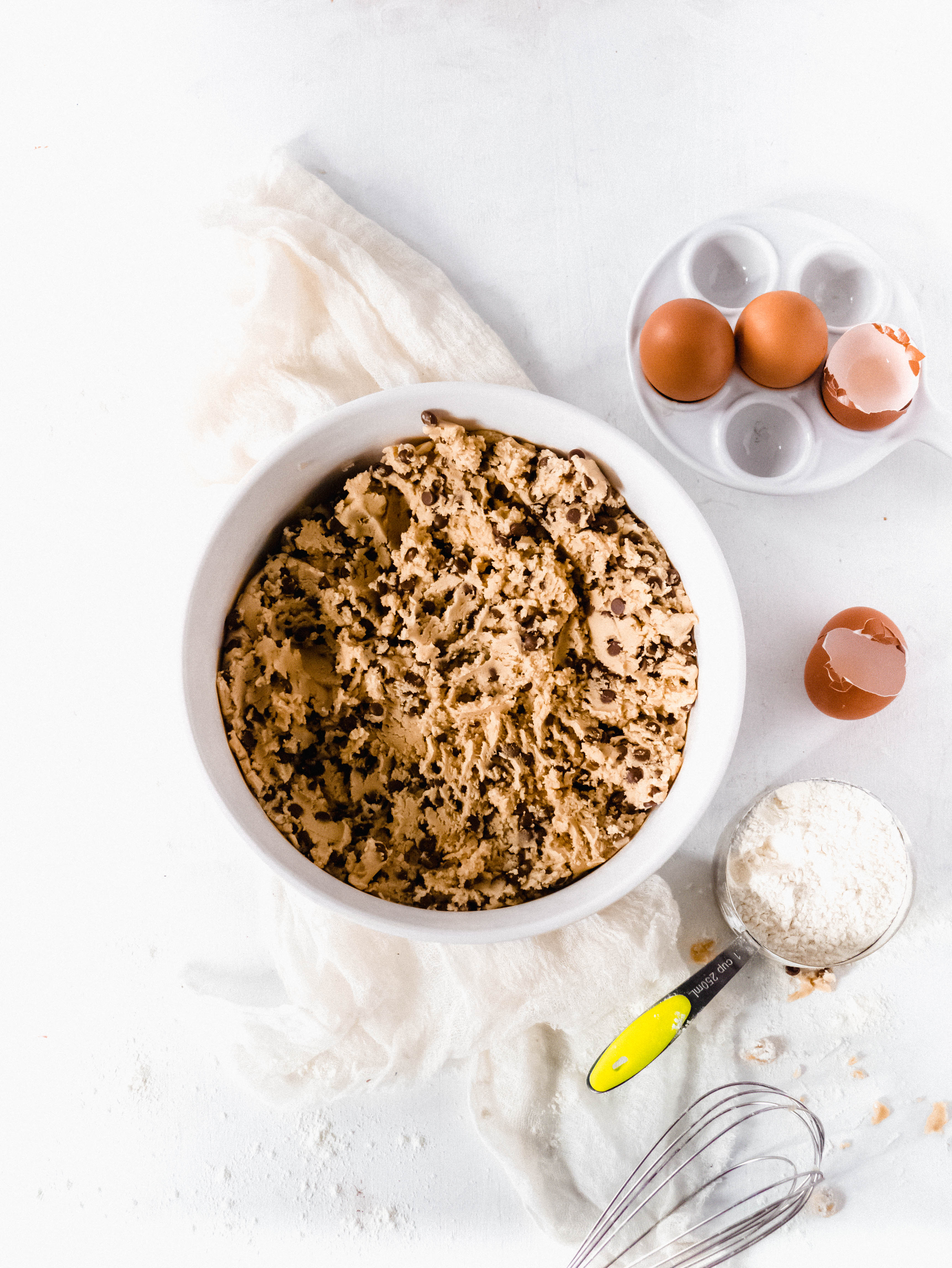 À l’aide d’un batteur électrique ou d’un robot, crémer le beurre et les sucres ensemble pendant environ 1 minute. Ajouter les œufs et la vanille et mélanger jusqu’à homogénéité. Ajoutez lentement les ingrédients secs. Incorporer les pépites de chocolat.