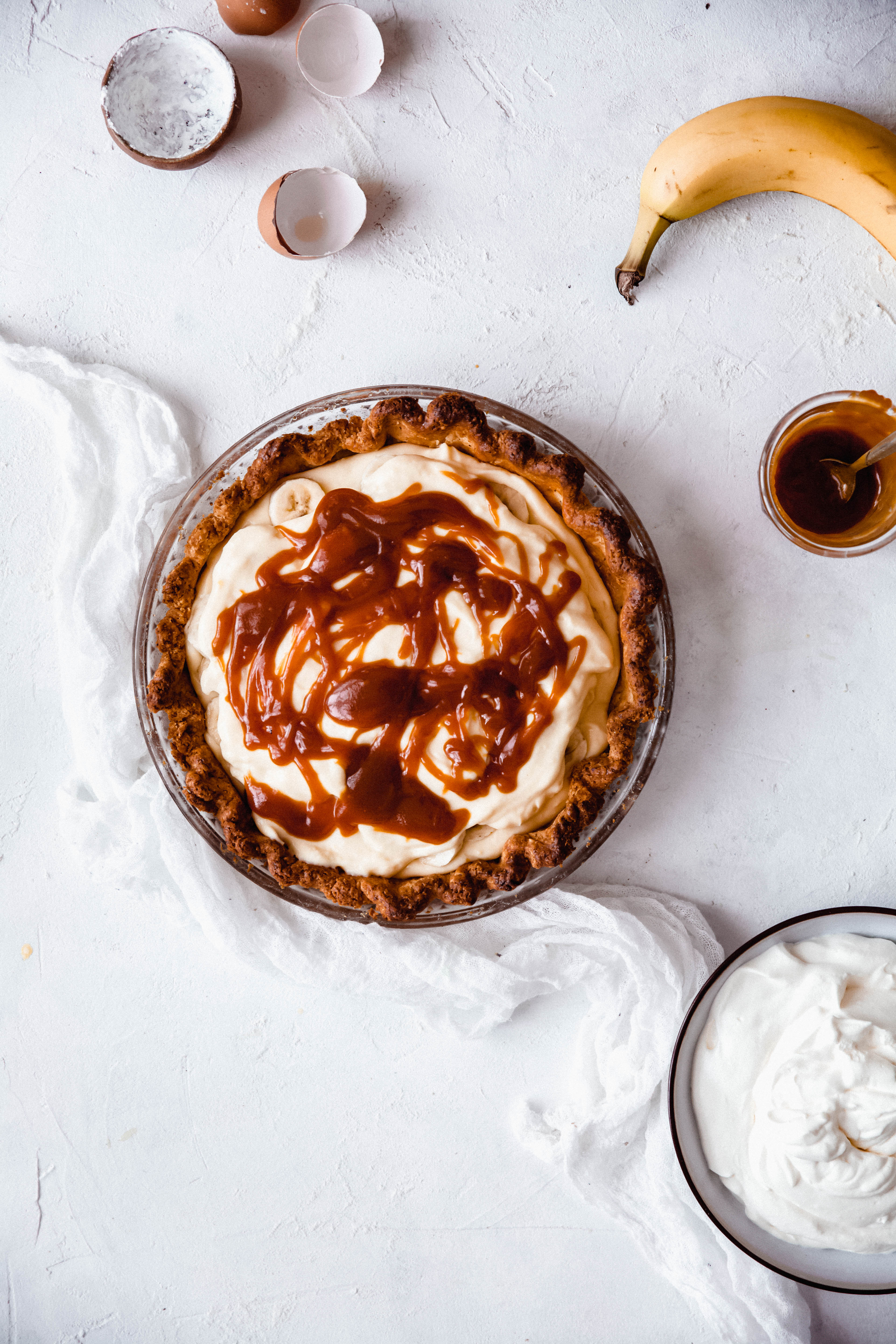 Étalez la moitié de la crème sur le fond de tarte, les tranches de bananes, le caramel, et mettre le reste de la crème.