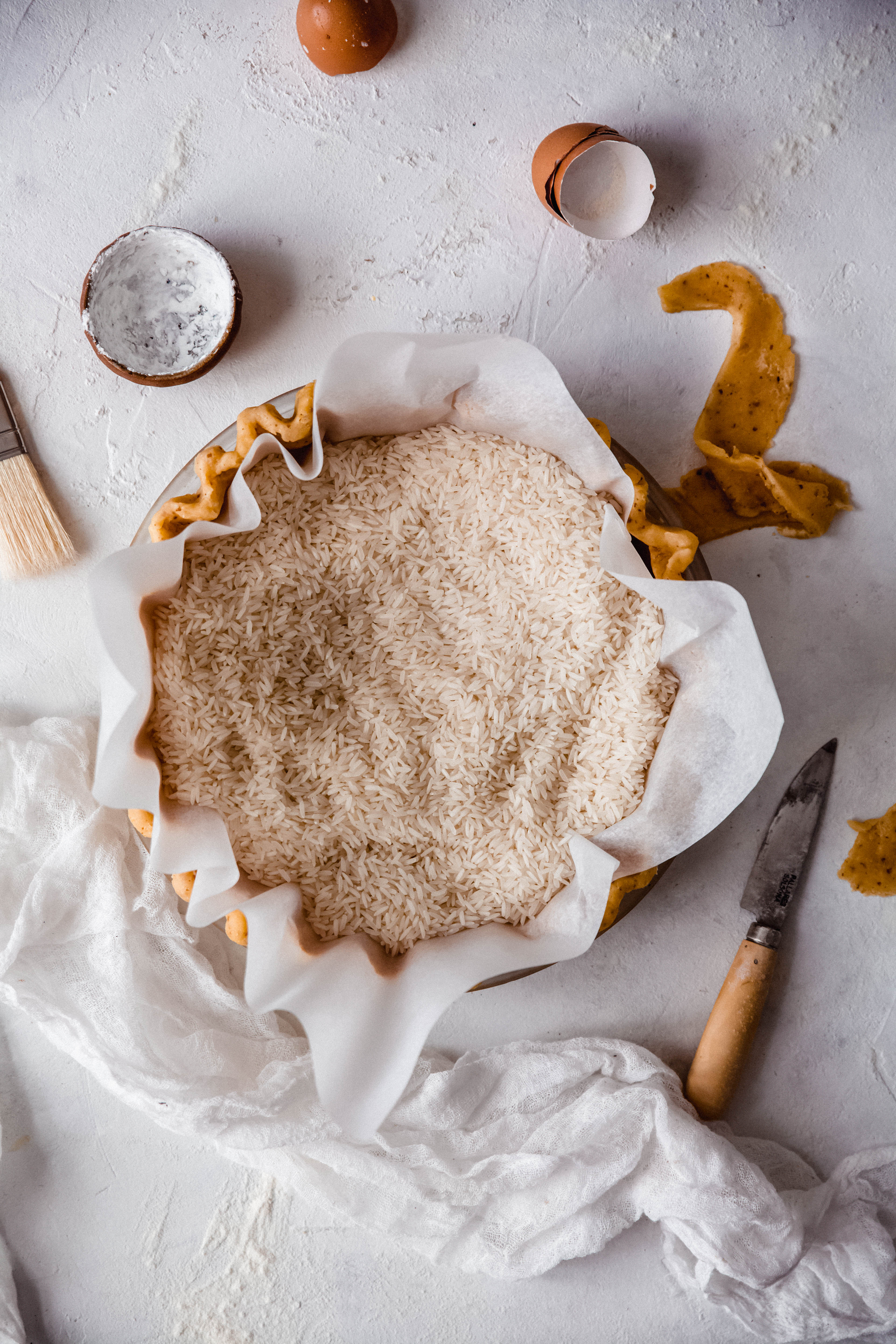 Découpez un carré de papier cuisson un peu plus grand que le moule. Placez ce carré sur la pâte et recouvrez-le de haricots secs ou de riz non cuit.