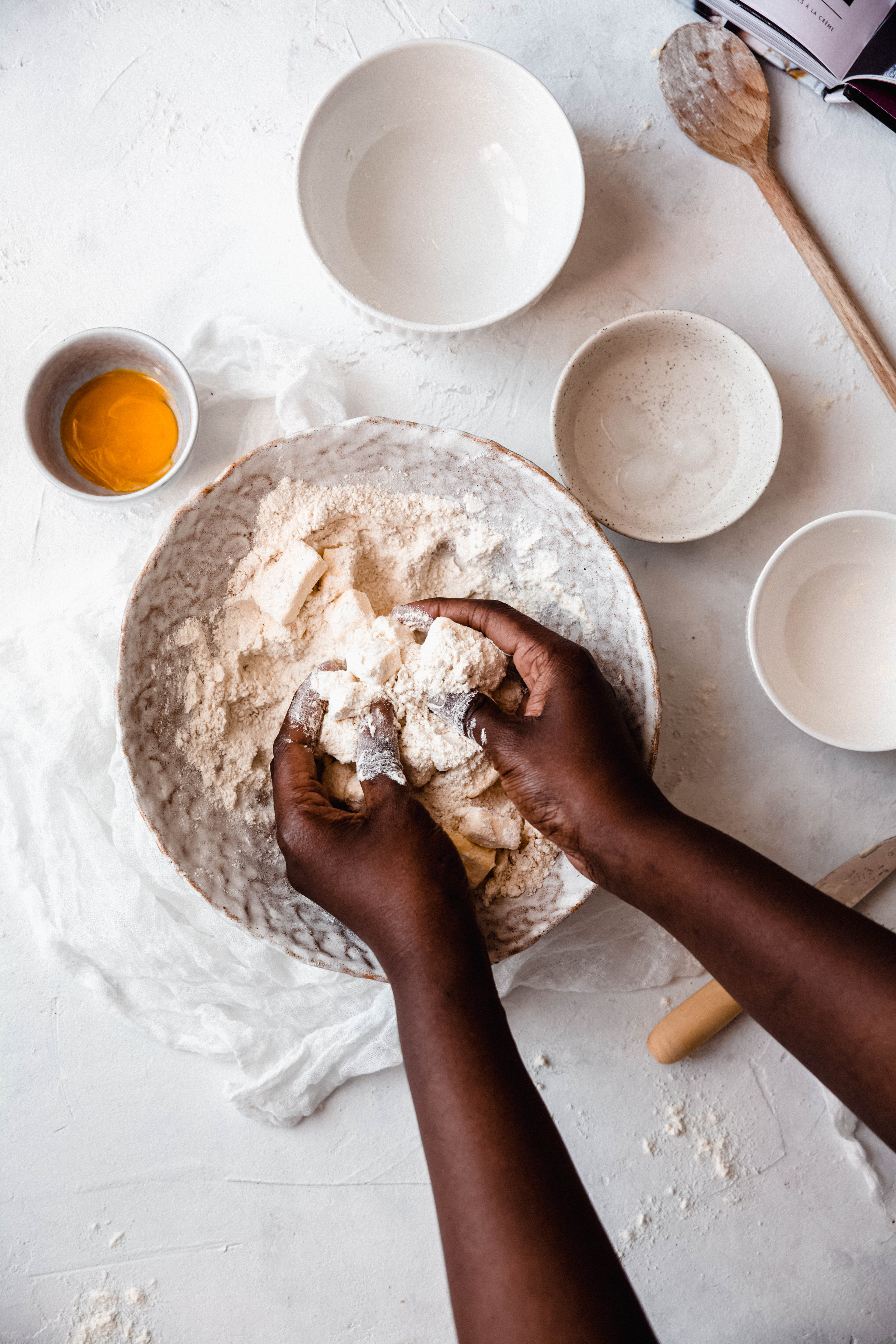 C’est une pâte simple à la base, qui est composée de farine, beurre, et eau. Ici, j’ajoute de la poudre d’amande et un jaune d’œuf. Elle demande très peu de pétrissage, pour éviter de faire travailler trop longtemps le gluten, qui donne de l’élasticité à la pâte, et donc moins de croustillant. Le beurre doit être très froid, car il ne doit pas être complètement fondu dans la pâte pour apporter ce feuilletage. L’eau glacée permet de conserver la solidité du beurre.