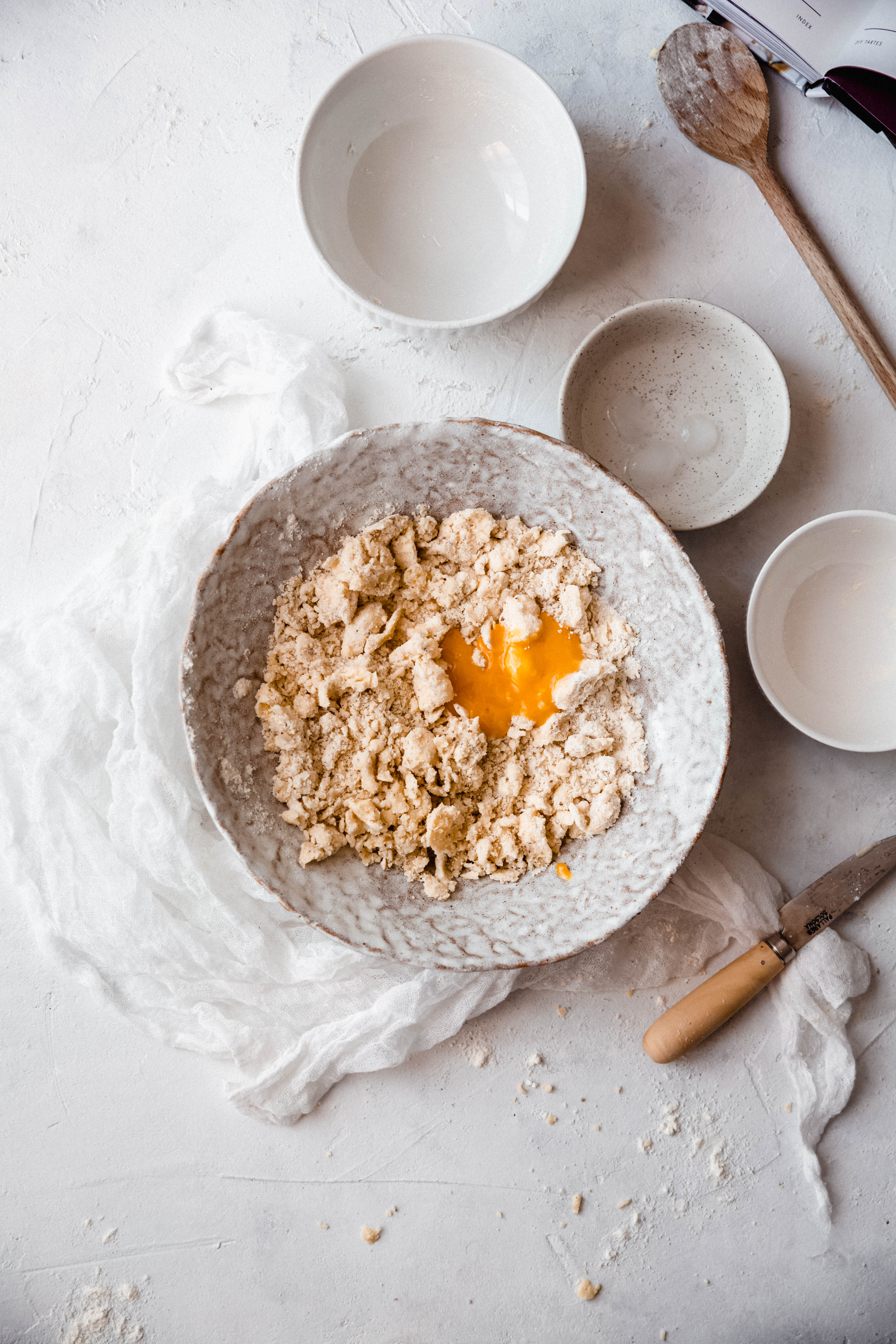 Une fois le beurre mélanger grossièrement, ajoutez le jaune d’œuf, mélangez en remuant avec une fourchette pour mieux le répartir.. Ensuite, ajoutez l’eau, une cuillère à la fois, avec la fourchette.