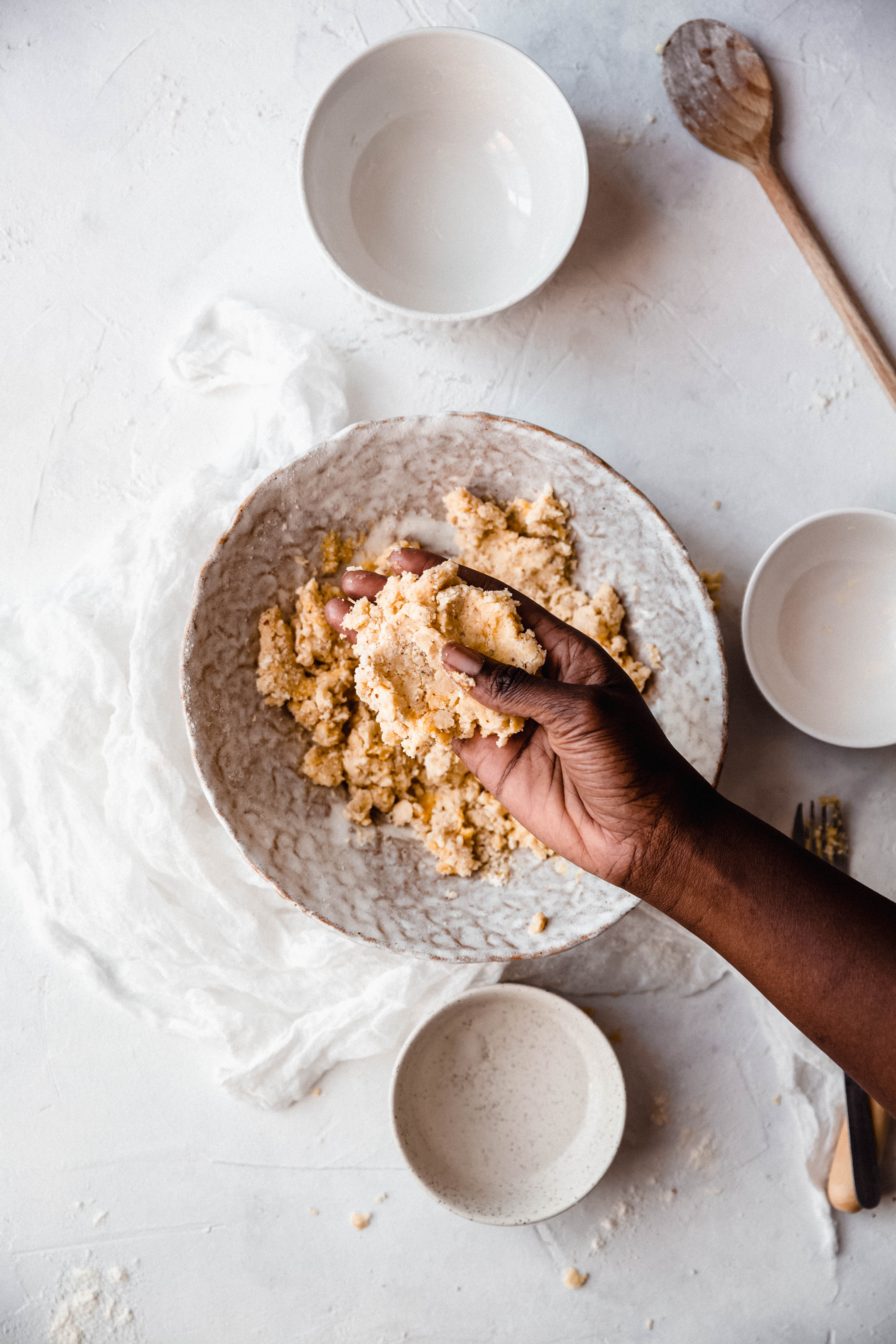 Ajoutez l’eau (commencez par un petite quantité que vous augmentez si la pâte vous semble trop sèche) et mélangez à l’aide d’une fourchette. Prenez un petit morceau: s’il tient quand vous le le tassez, c’est qu’il y assez d’eau.