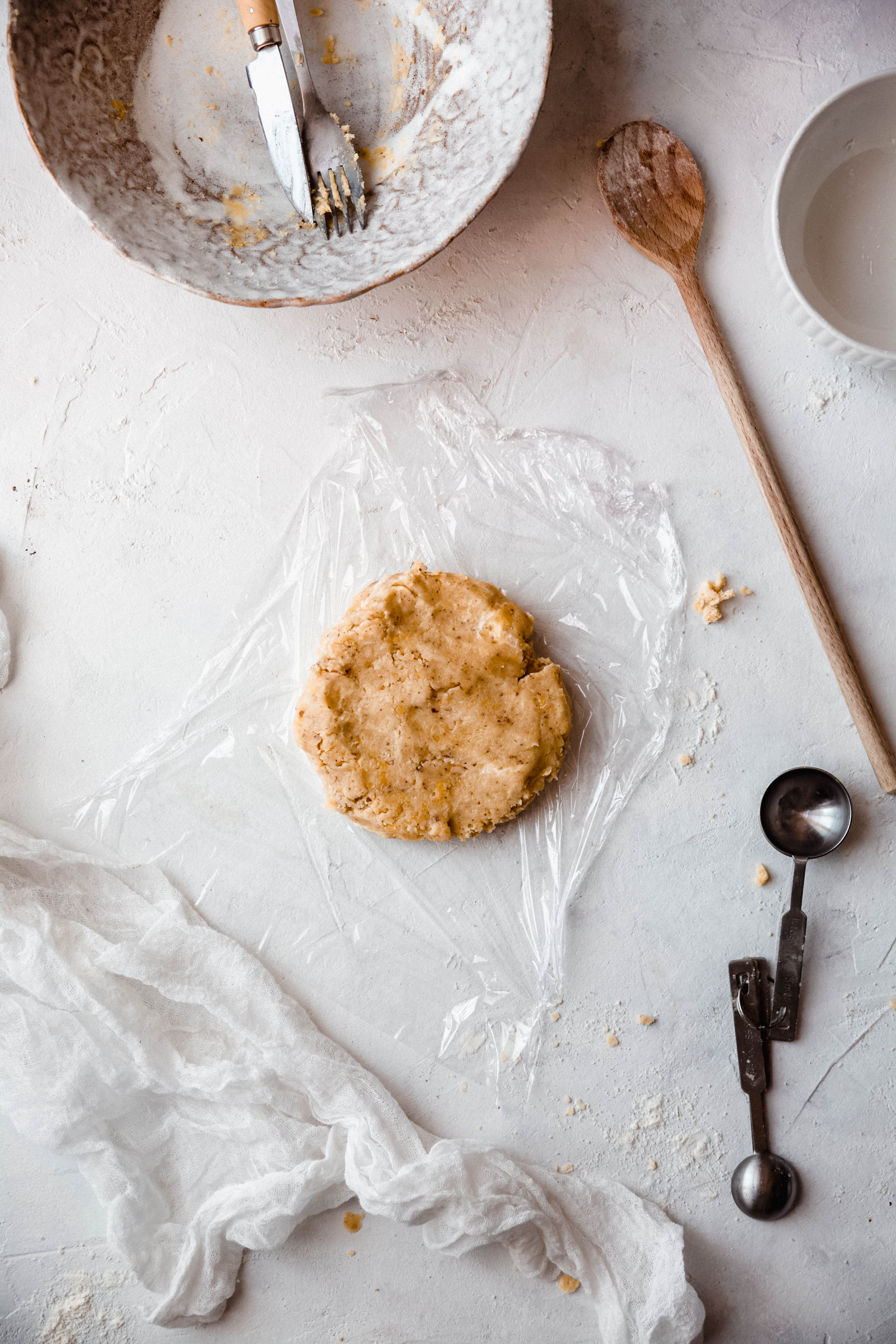 Lorsque vous prenez un morceau de pâte, si celui-ci ne se défait pas lorsque vous le tassez, c’est que vous avez mis assez d’eau. Il suffit que la pâte tienne. Mettez-la sur un film transparent, aplatissez-la légèrement, recouvrez-la de film et laissez-la au réfrigérateur toute la nuit de préférence, sinon au moins 1 heure.