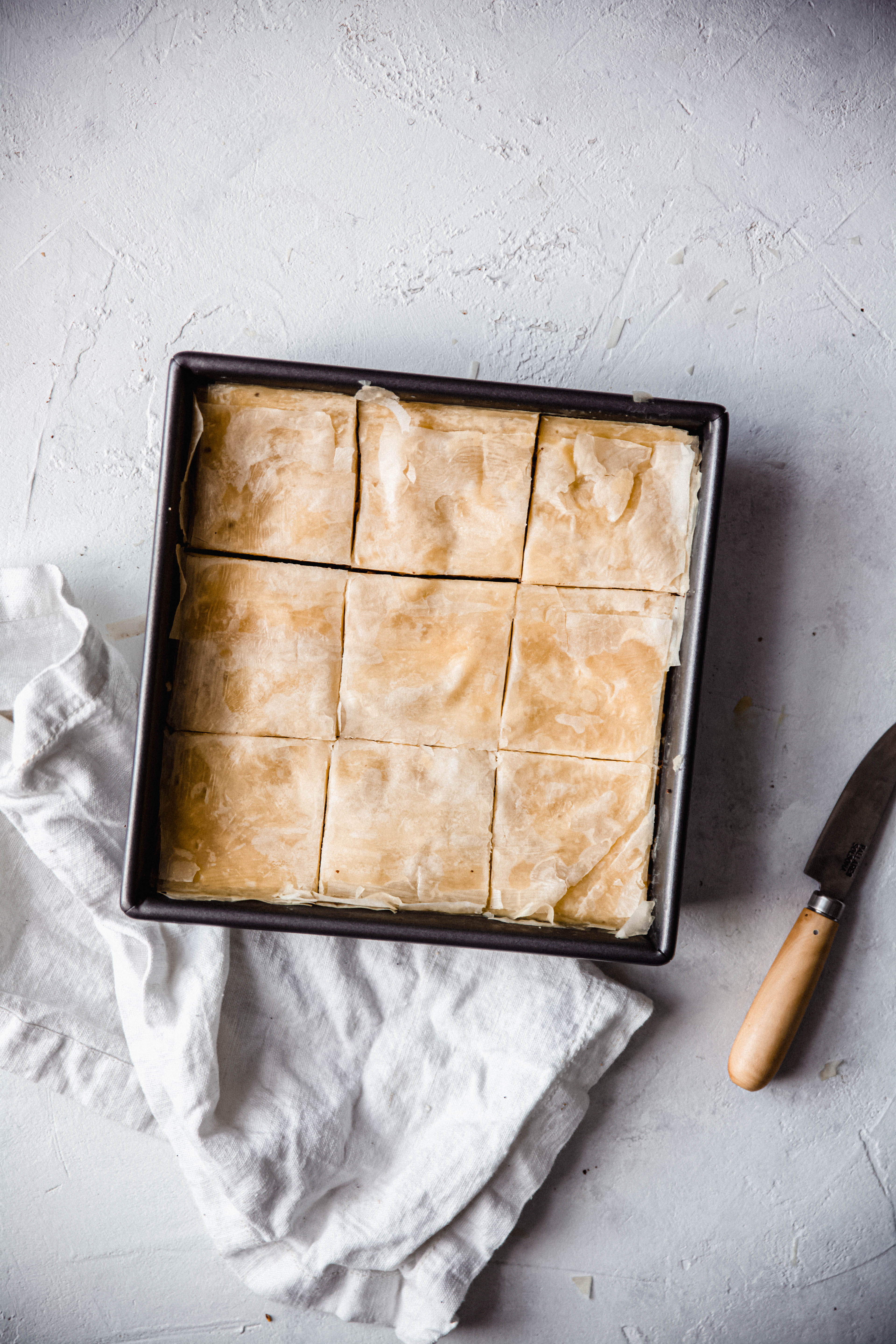 Ensuite, découpez la pâte filo, de la taille de votre moule (20 x 20 cm).