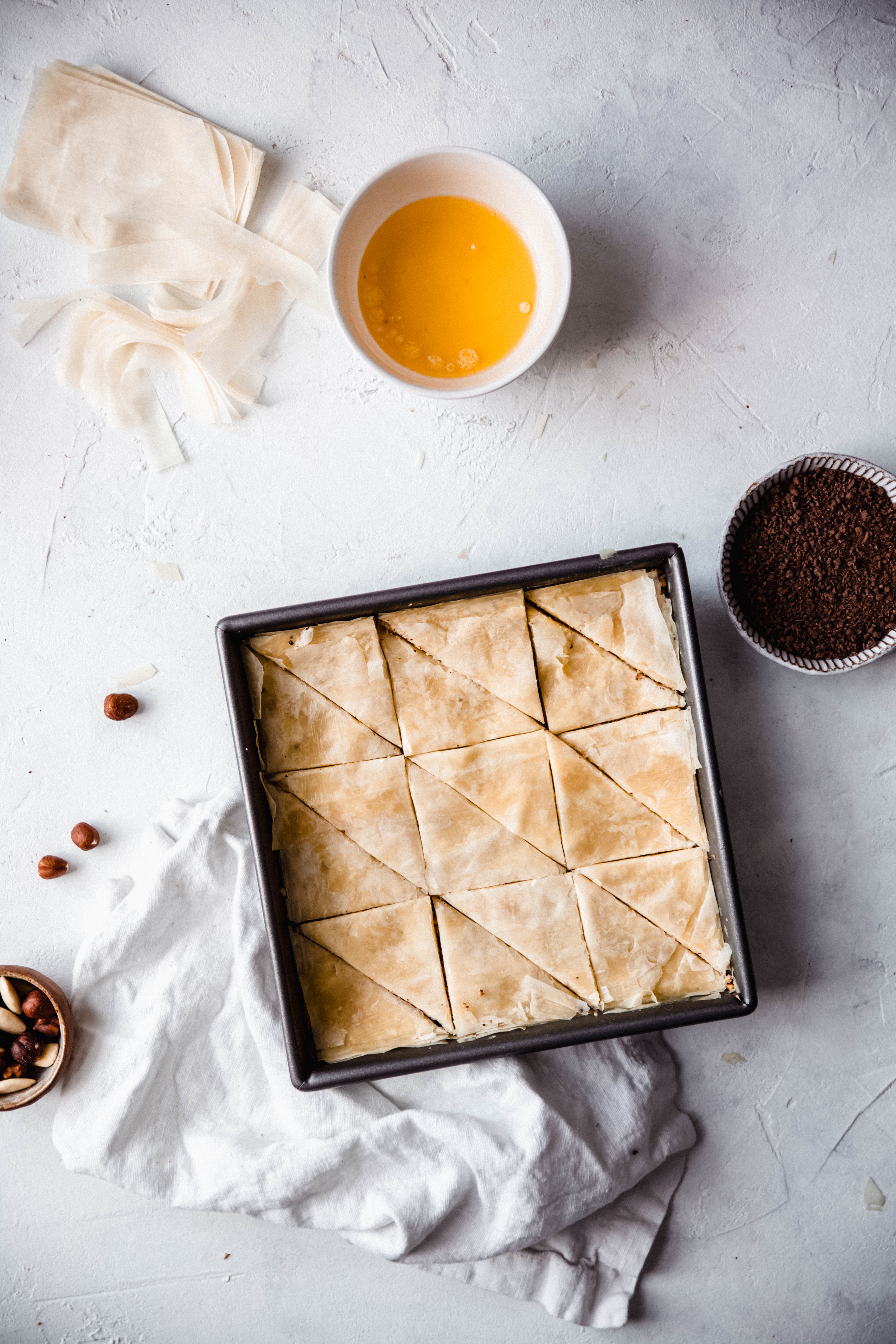 Coupez la pâte filo en carré de 20 cm comme le moule.