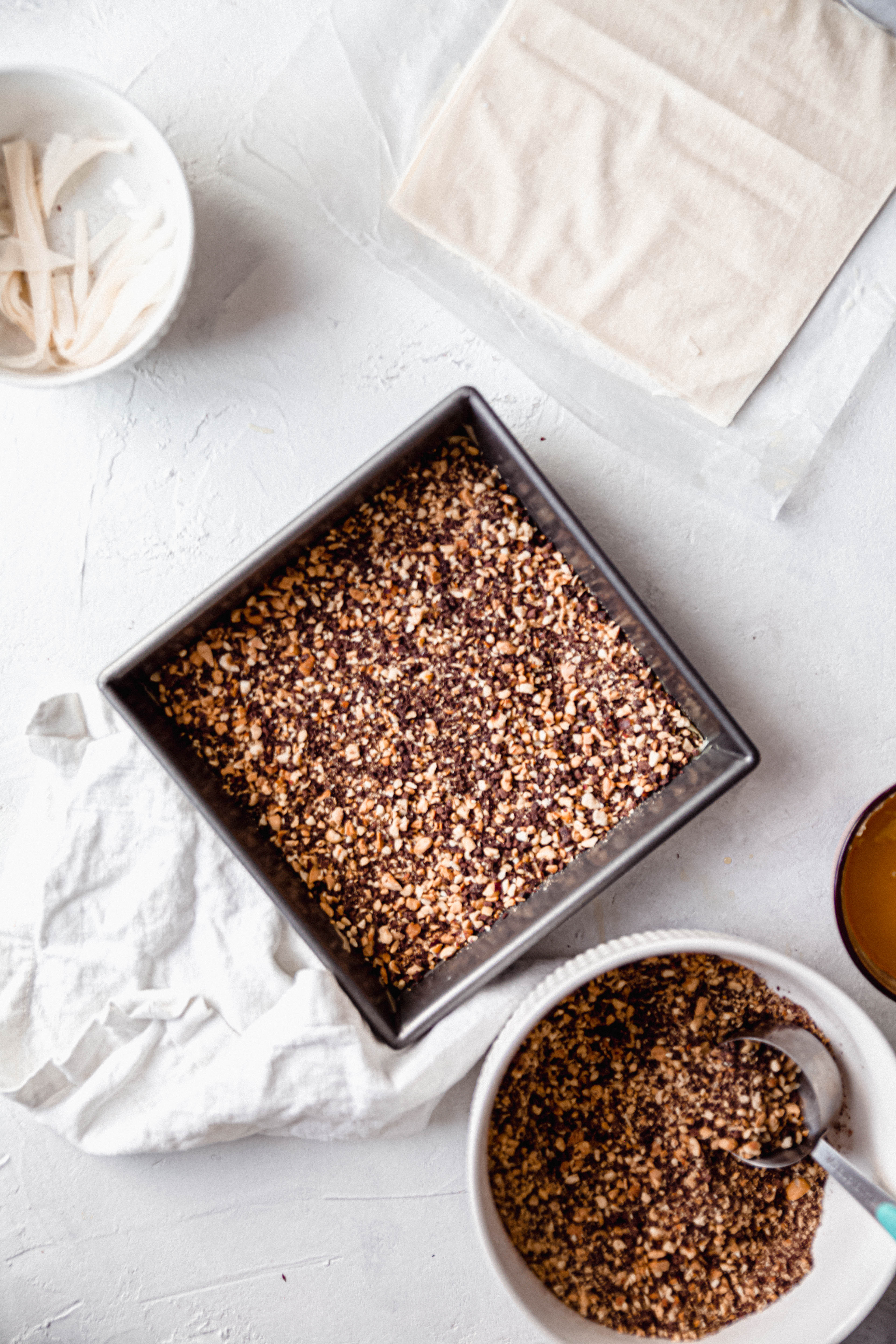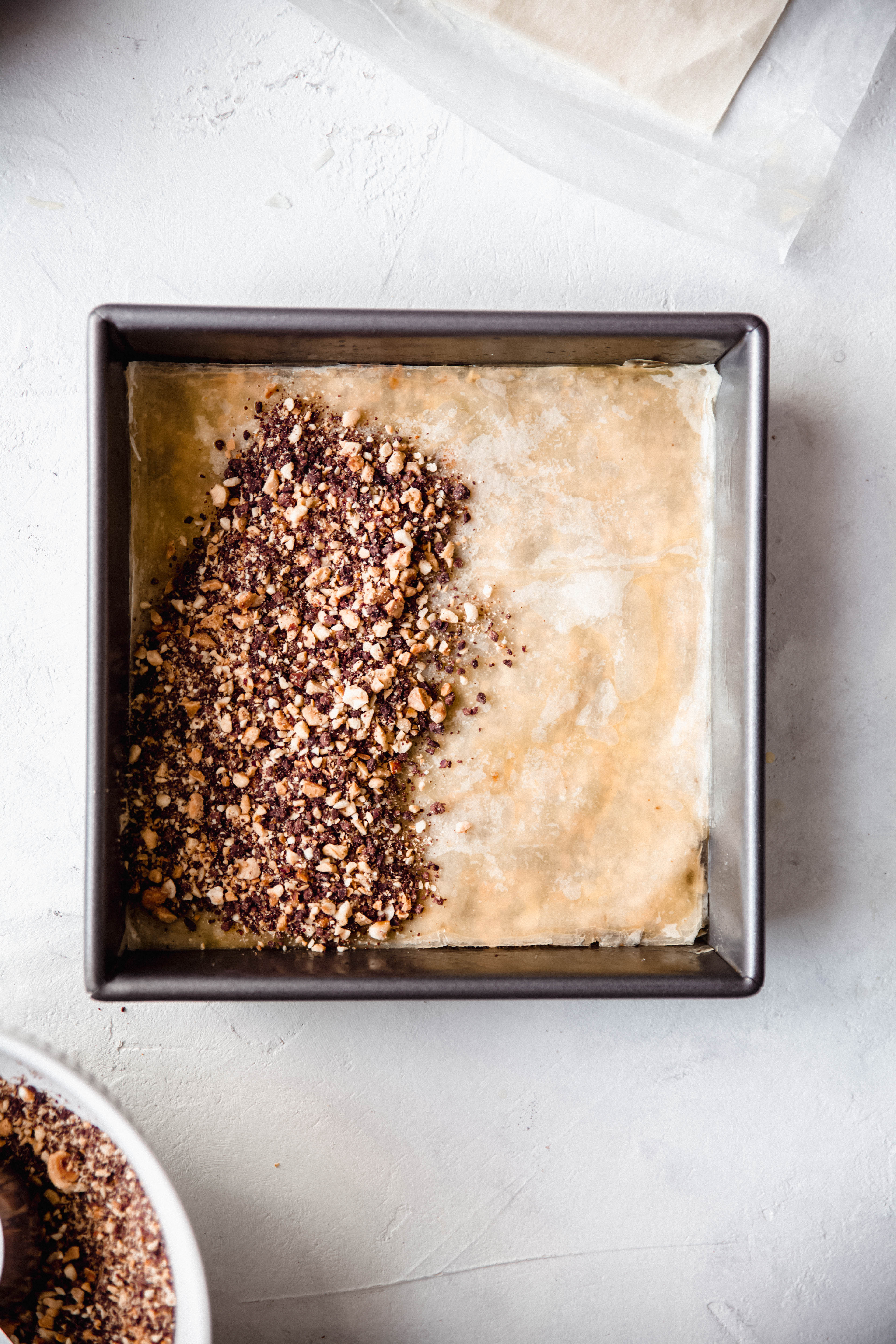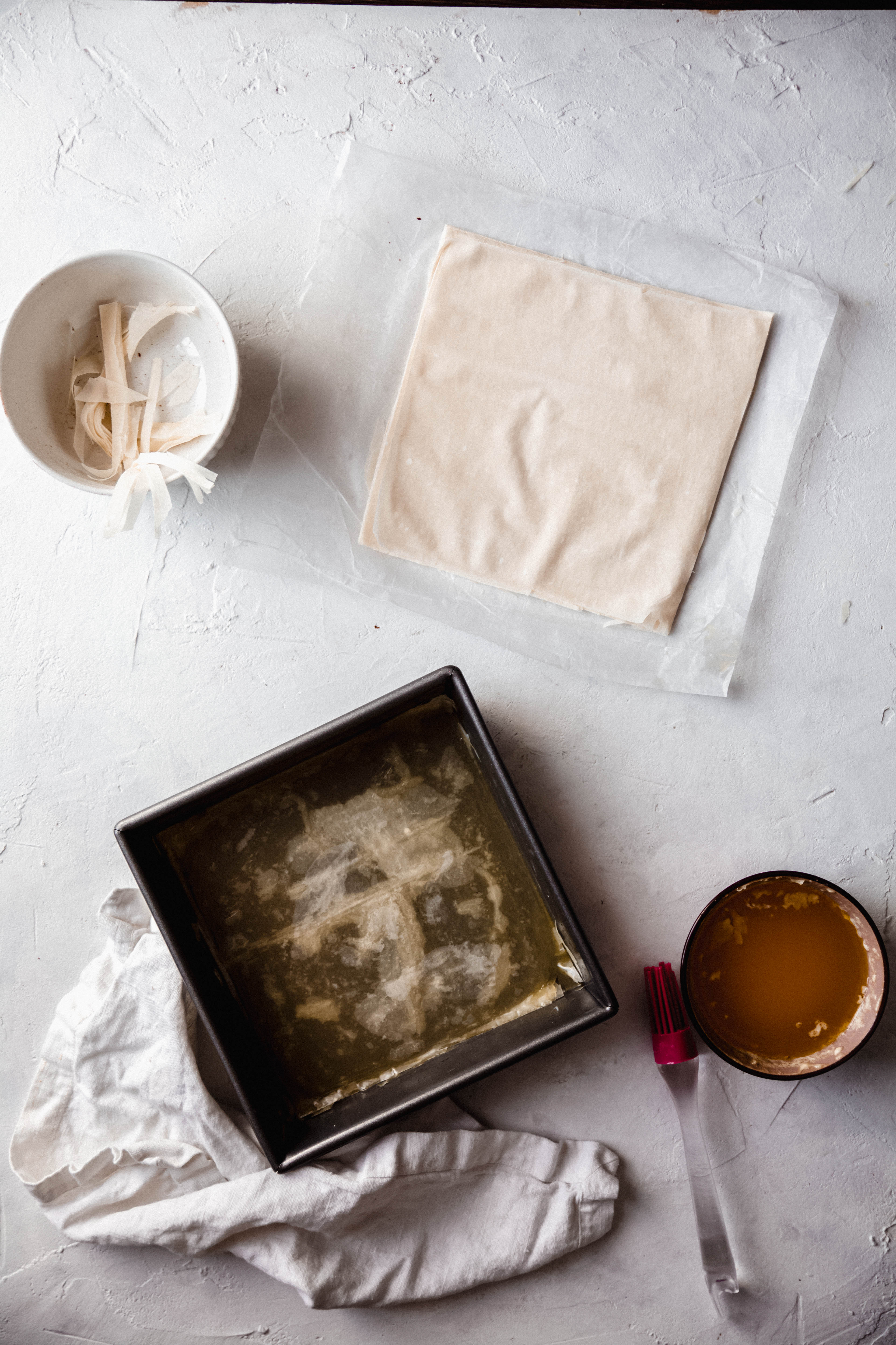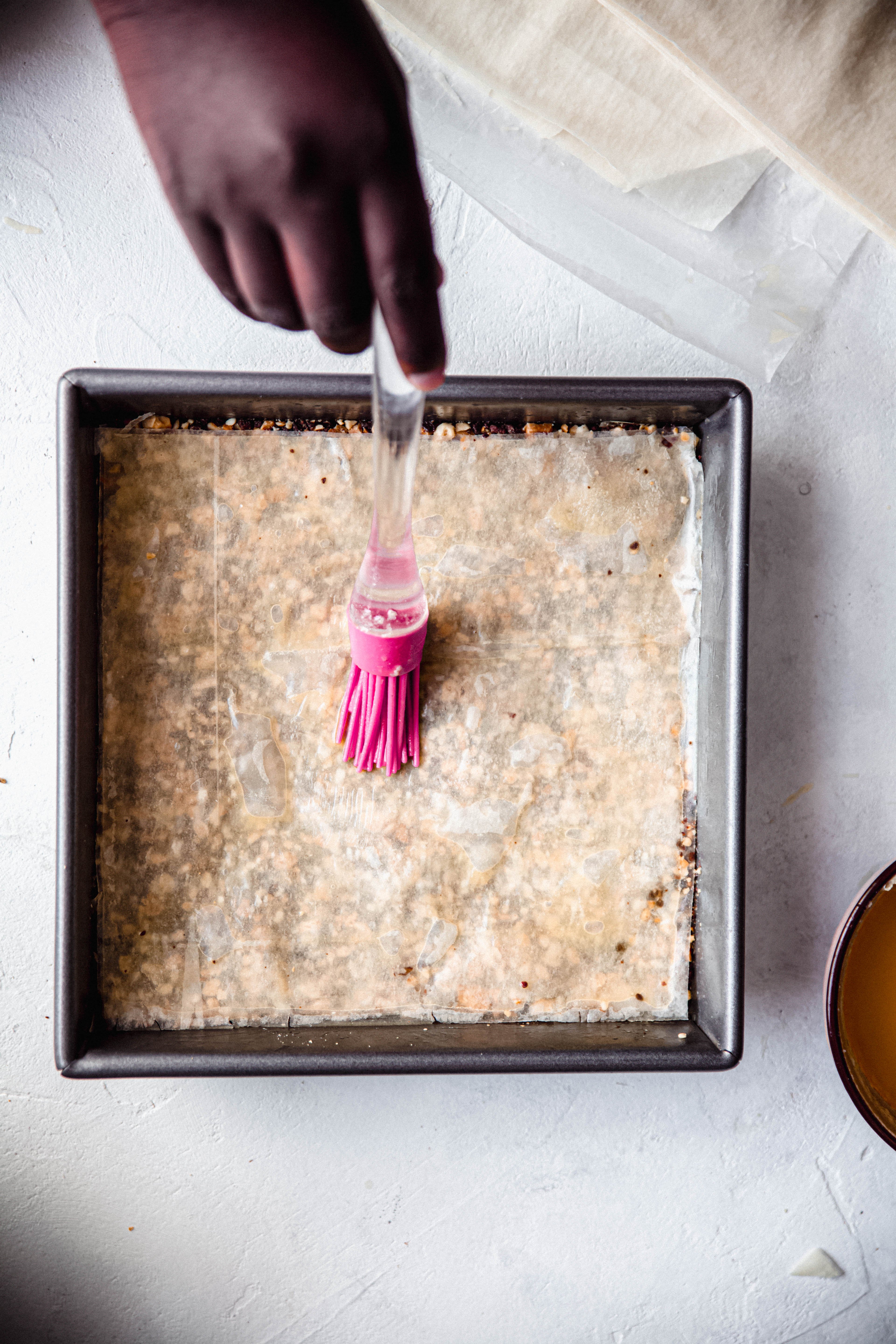 Beurrez généreusement le moule de beurre clarifié à l’aide d’un pinceau. Placer une feuille de pâte filo dans le moule et beurrez généreusement le dessus à l’aide du beurre clarifié fondu et d’un pinceau à pâtisserie. Répétez jusqu’à ce que vous ayez 8 feuilles de pâte filo pour la couche inférieure.