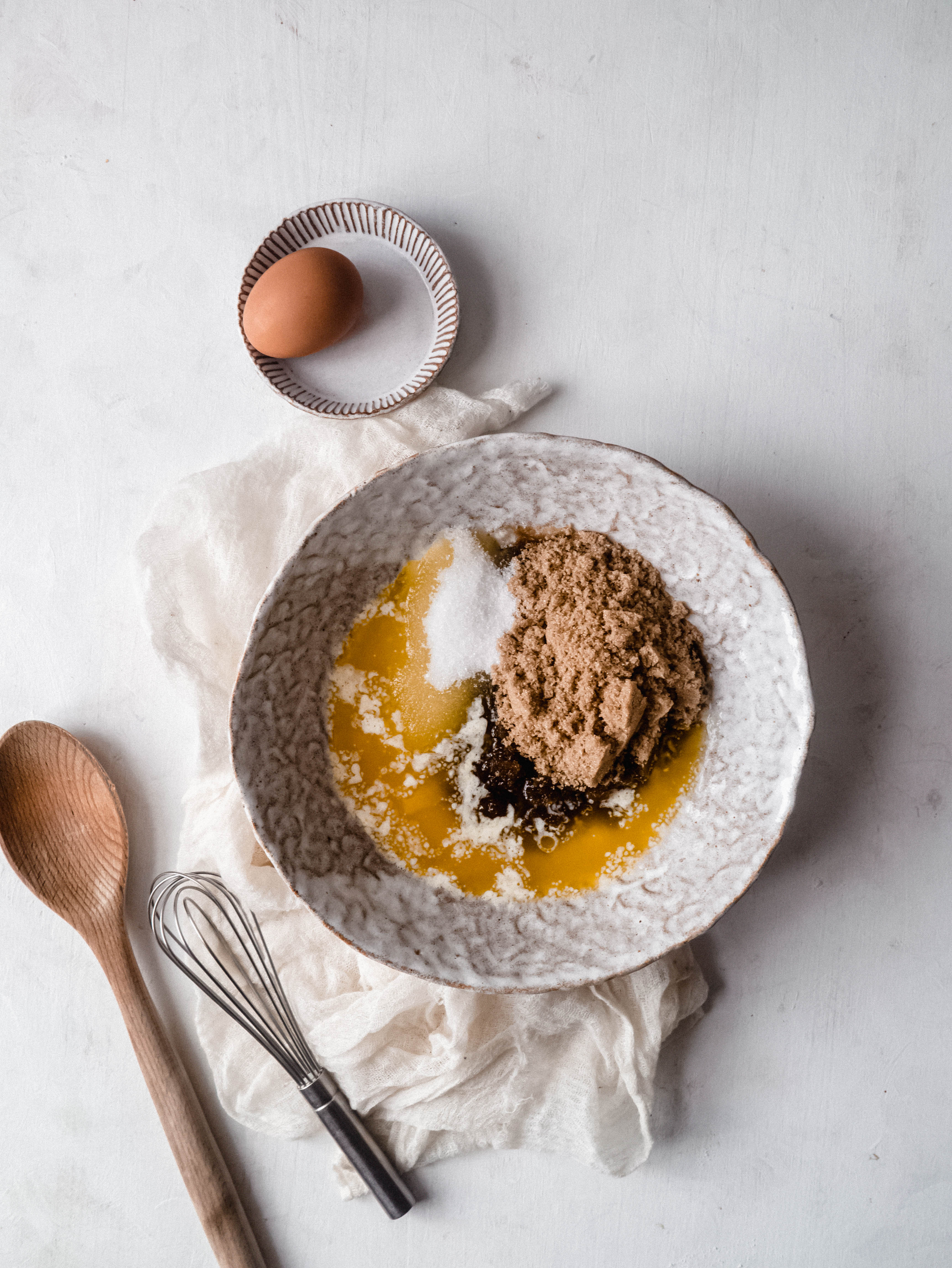 - Faire fondre le beurre à feux doux ou au micro-onde. Une fois fondu, versez le beurre dans un grand bol et ajoutez les sucres. Mélangez jusqu’à consistance homogène. Ajoutez l’œuf pour obtenir une consistance lisse et brillante.