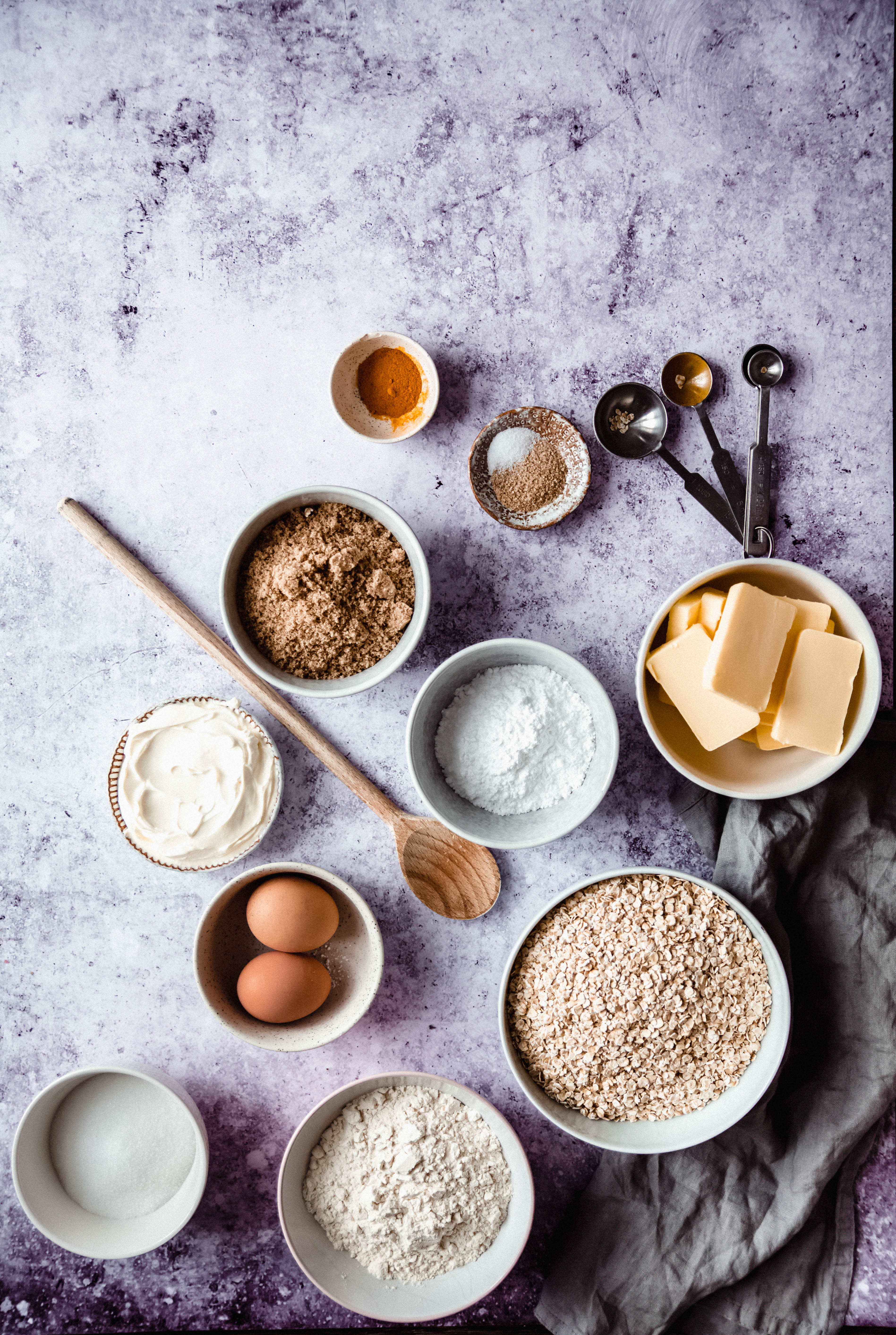 Préchauffez le four à 170°C. Dans un bol, fouettez les sucres et le beurre 3 minutes pour obtenir une crème. Ajoutez les œufs et fouettez à nouveau jusqu’à ce ça soit homogène. Versez les flocons d’avoines, la vanille, le curcuma et le sel. Mélangez avec une maryse. Cuire les cookies pendant 12 minutes et laissez refroidir.