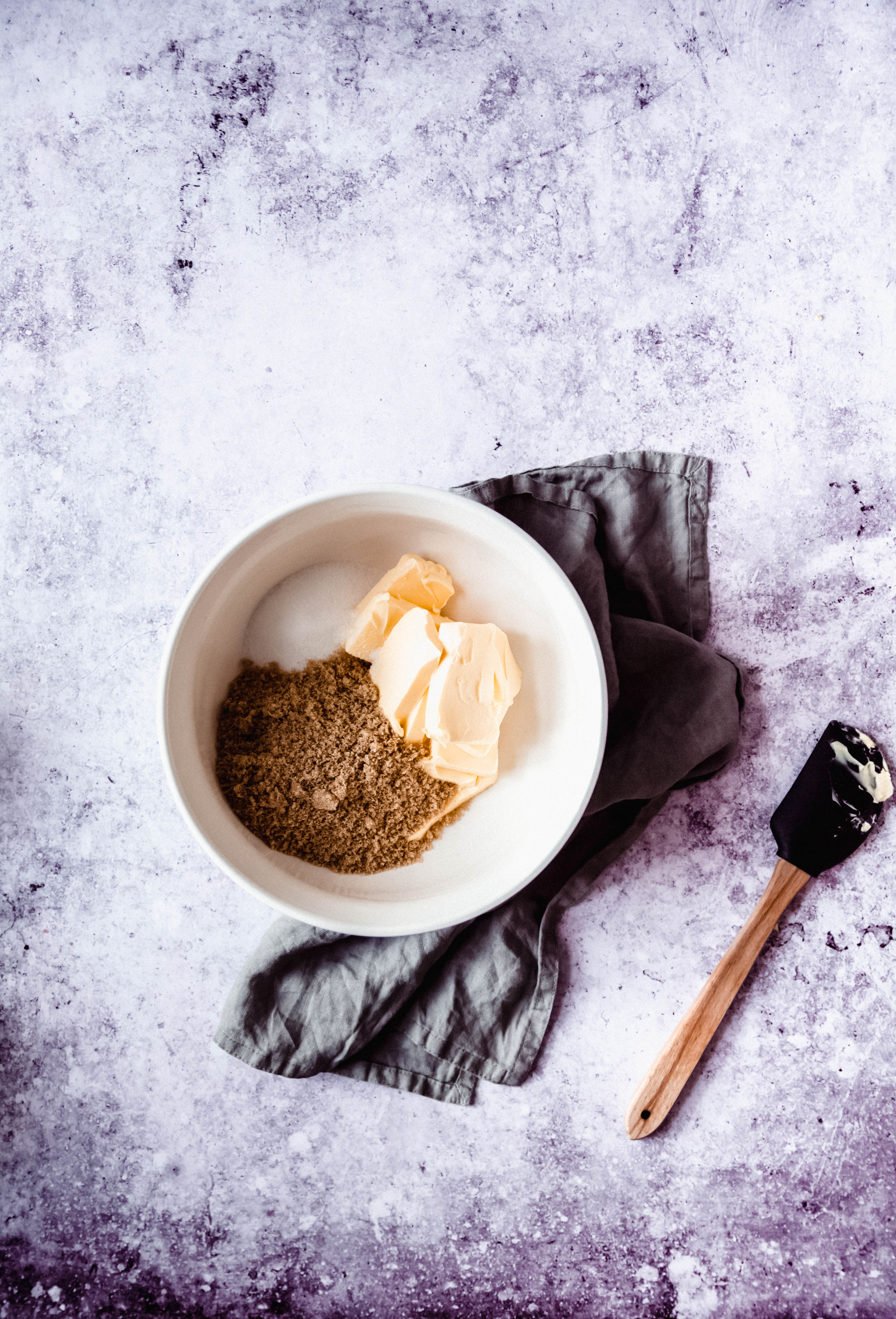 - Préchauffez le four à 170°C. Dans un bol, fouettez les sucres et le beurre 3 minutes pour obtenir une crème.