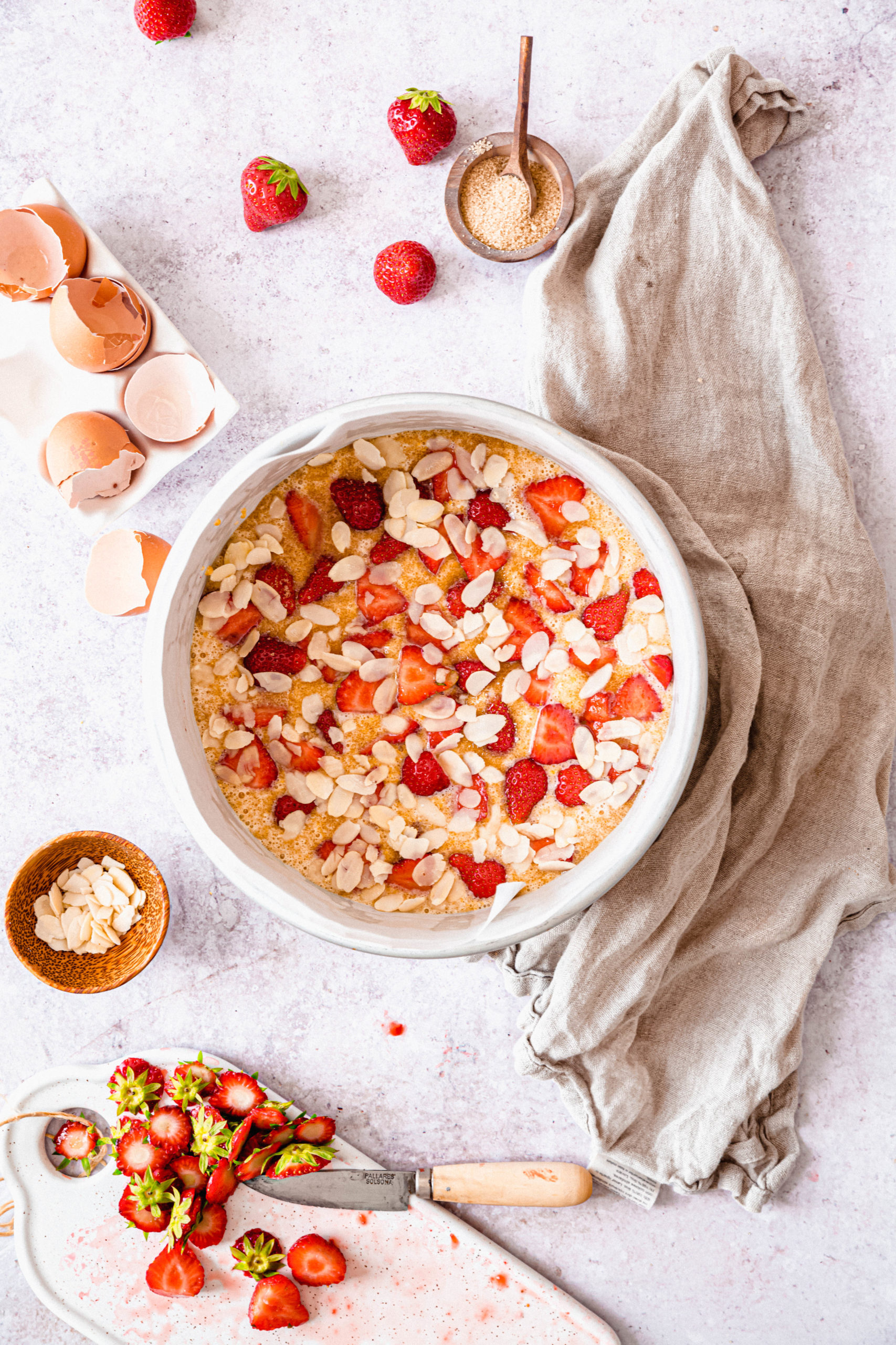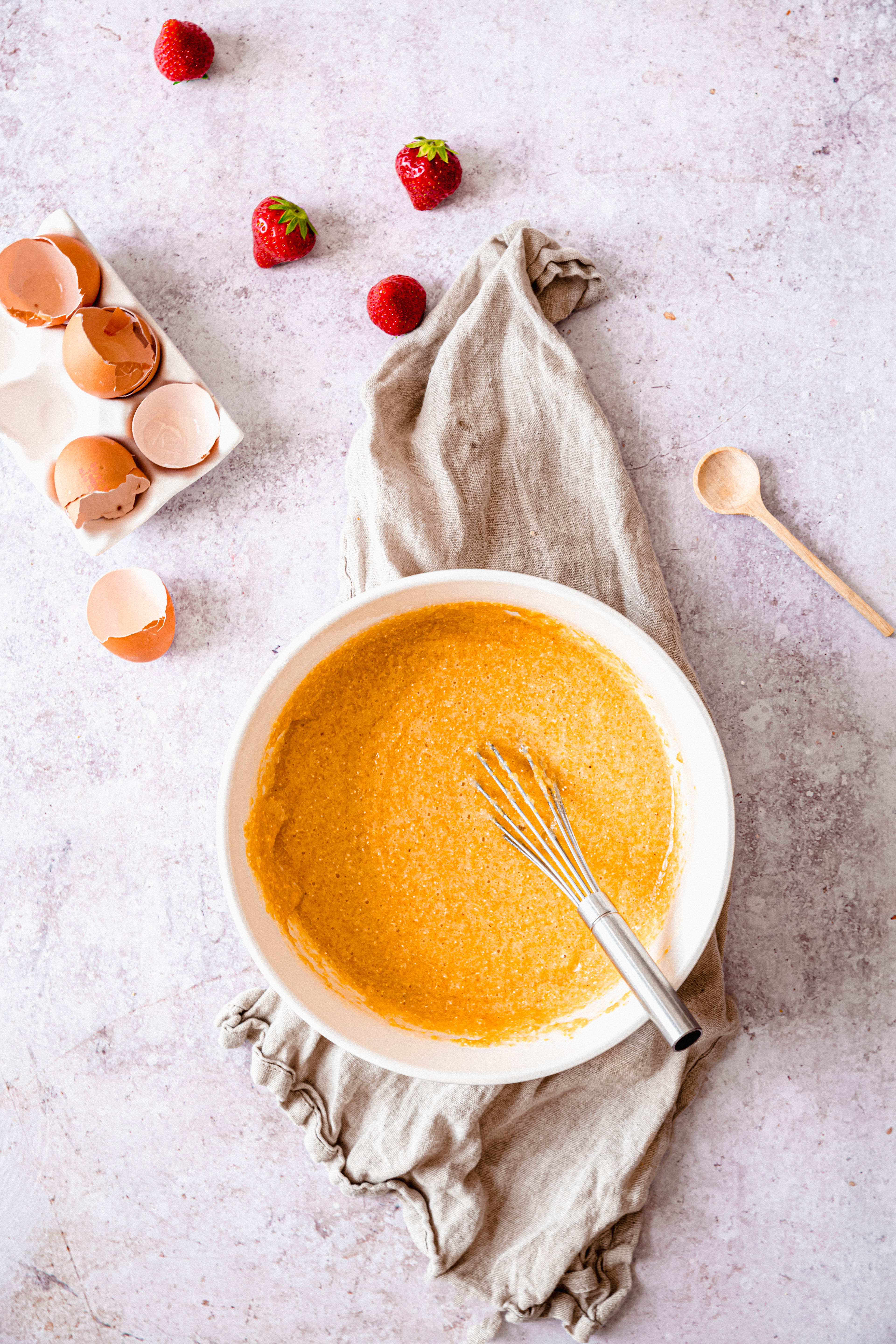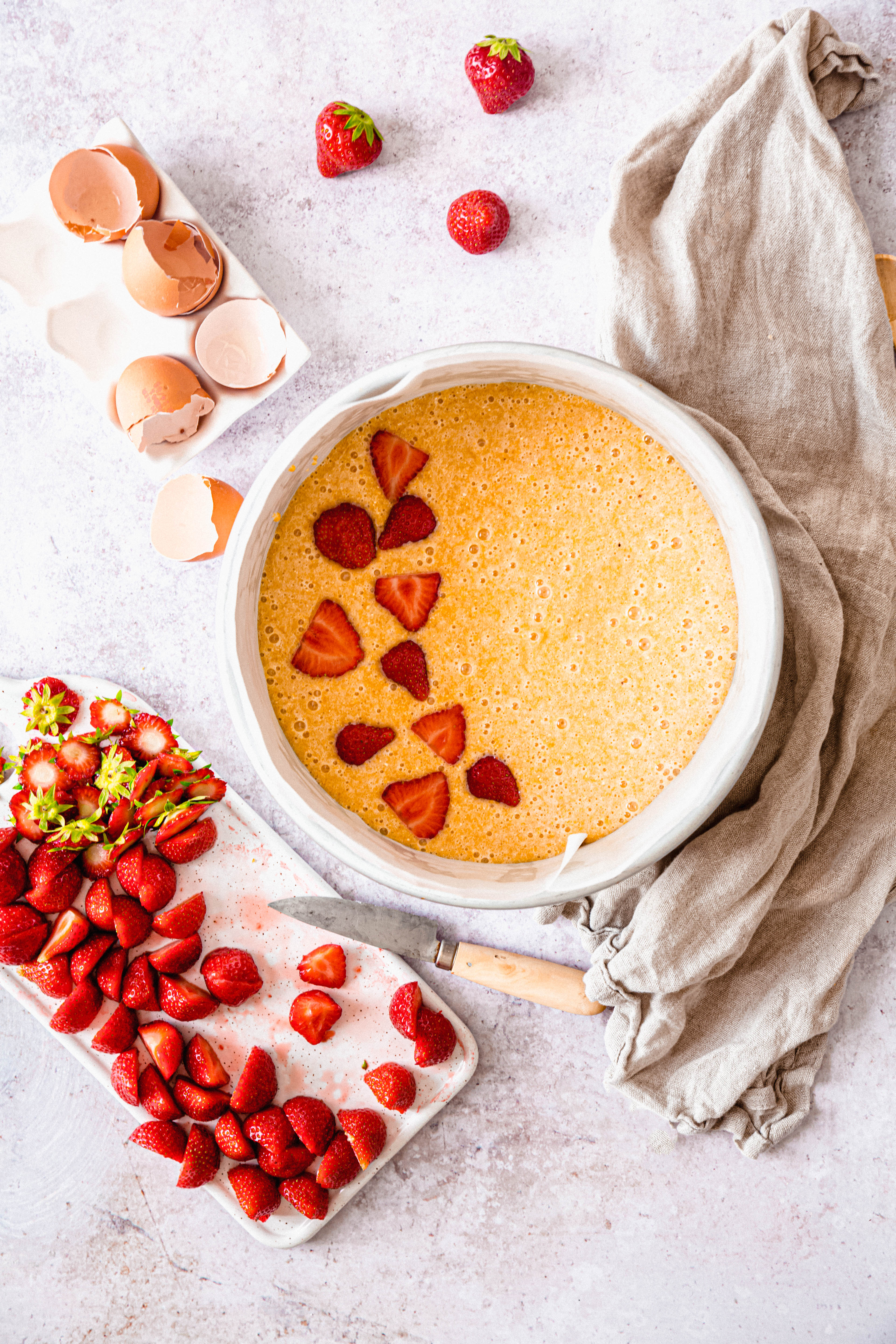 - Terminez en ajoutant la polenta et la levure. Et garnissez de fraises fraîches coupées en deux.