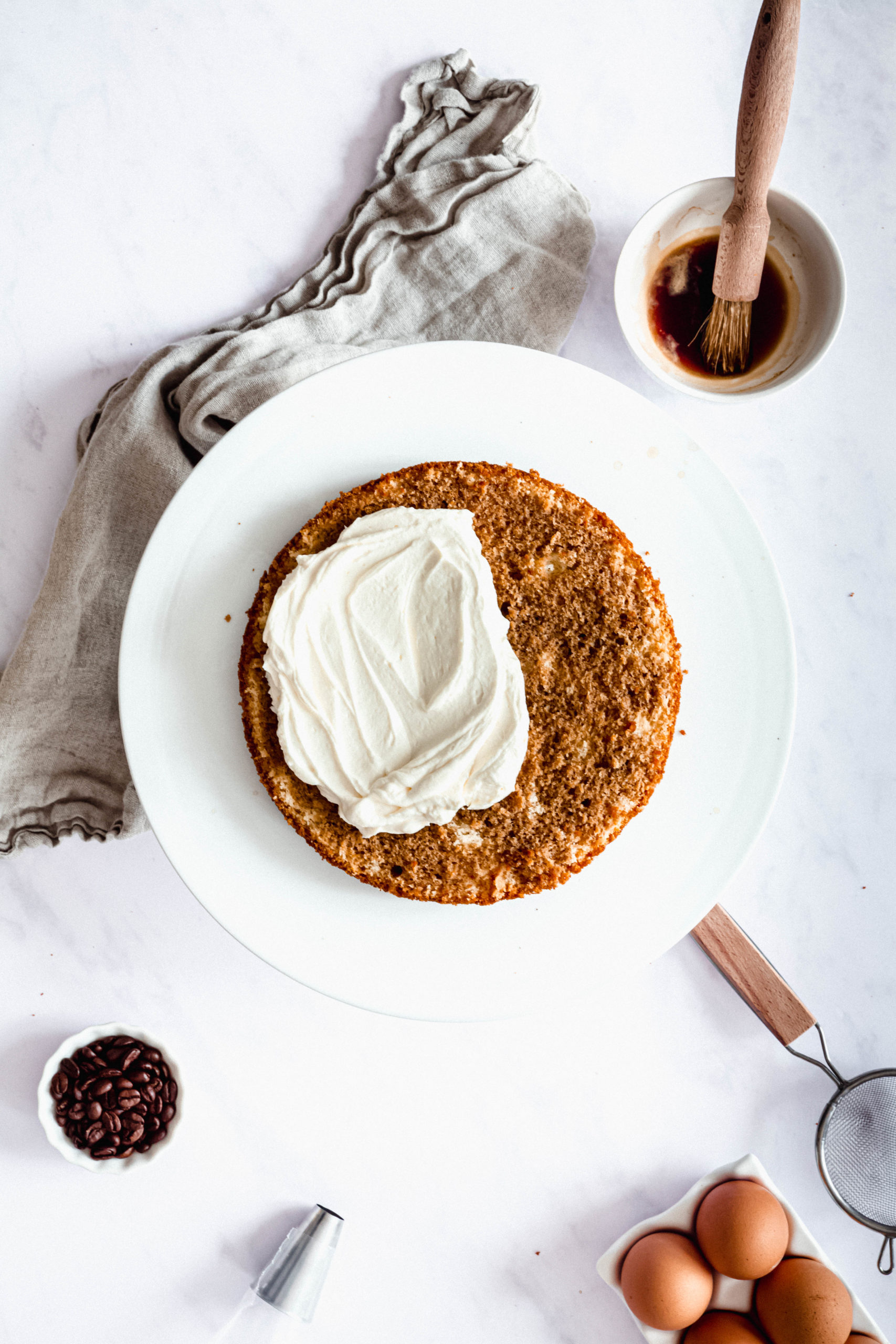 Déposez la première génoise, sur une petite cuillère de crème sur le plat de service. Imbibez la génoise à l'aide d'un pinceau ou d'une cuillère le café froid. - Garnir la génoise d'un quart de la crème.
