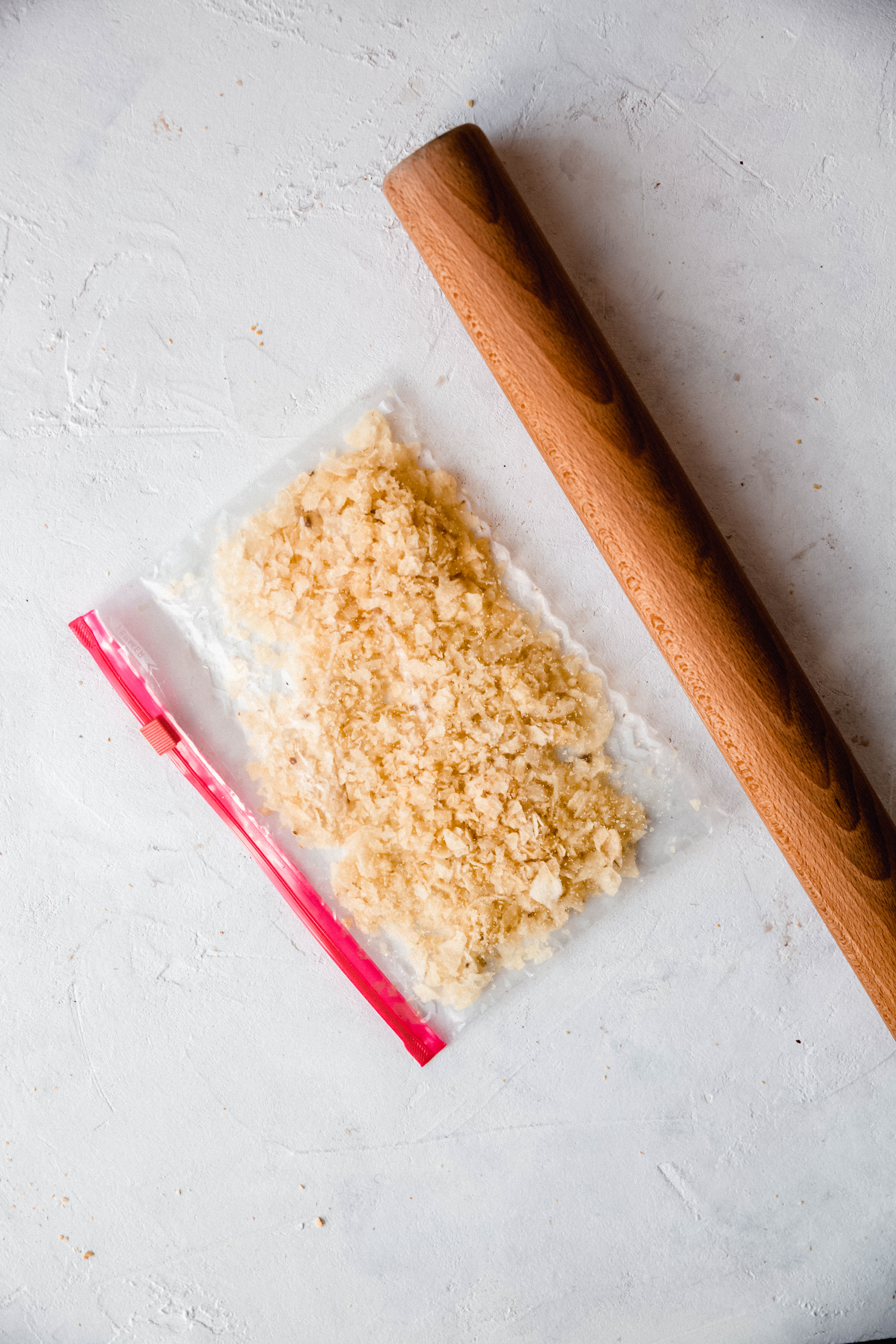 Dans un bol mettre le quinoa soufflé, les cacahuètes non salées concassées, les chips écrasés, mélangez.