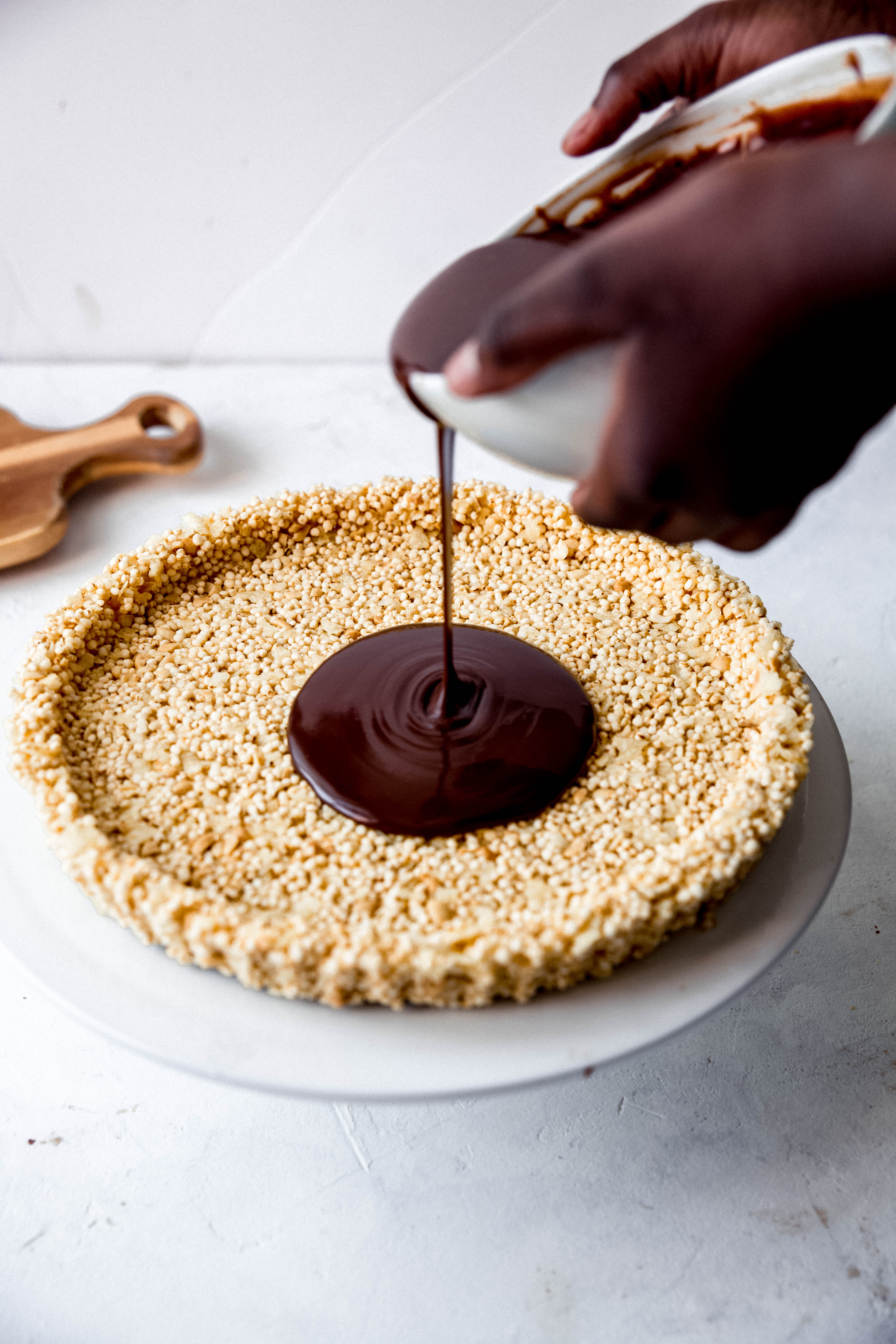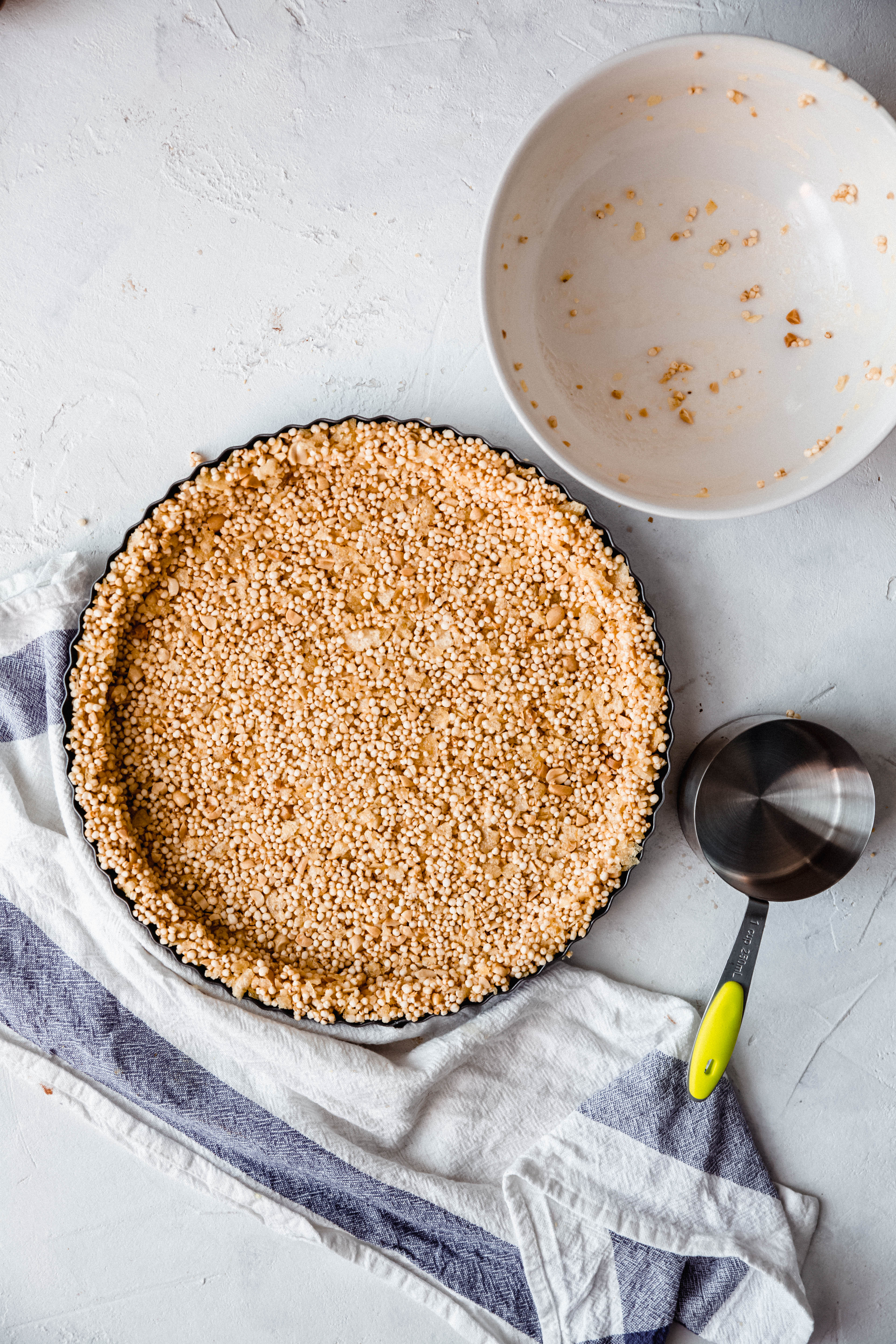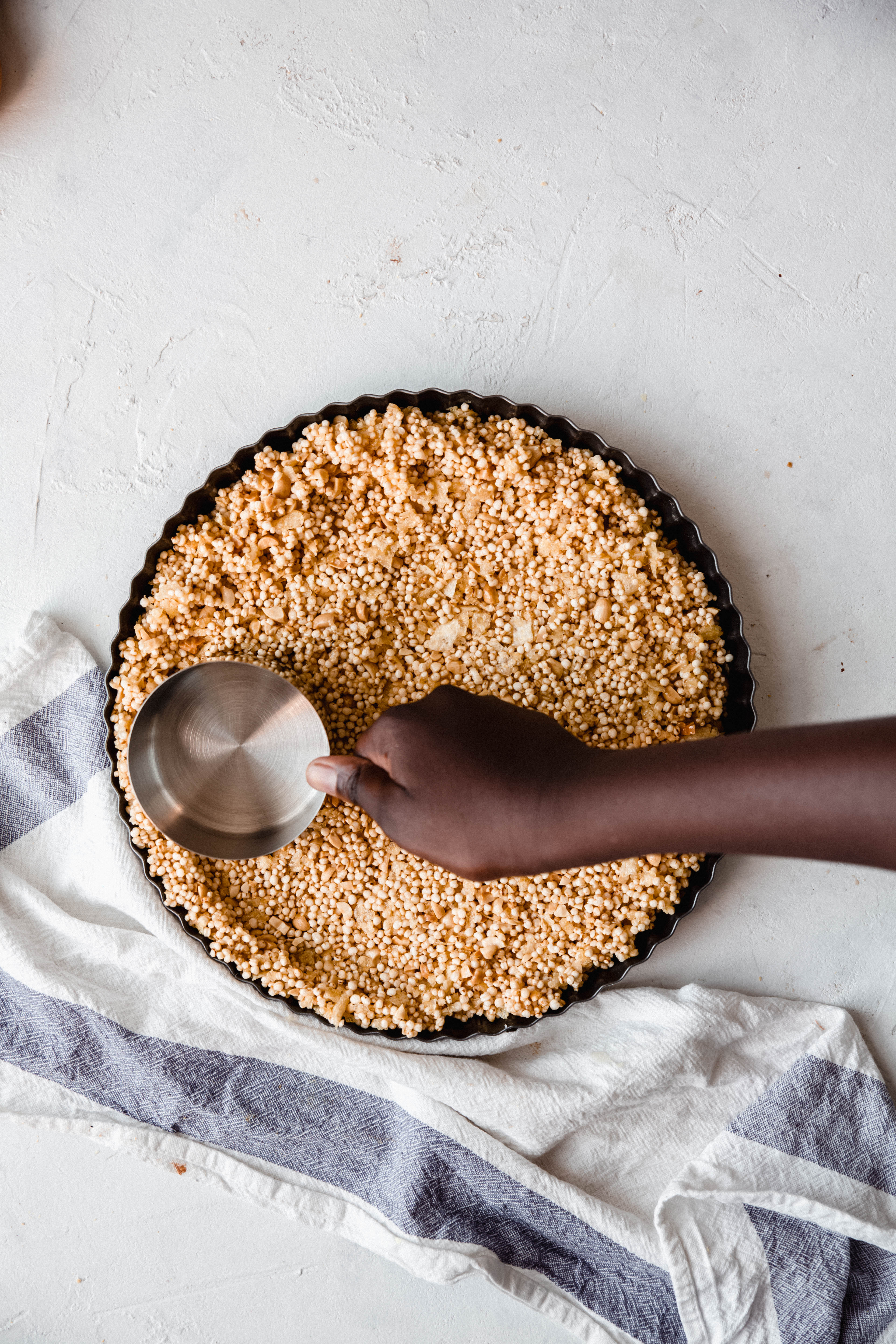 Le quinoa soufflé apporte une belle saveur en bouche, ce petit goût soufflé que l’on retrouve dans les céréales soufflé comme le riz soufflés. Mais si vous n’en avez pas, prenez aussi du riz soufflé ou bien des flocons d’avoines, ce qui apportera plus de densité dans le fond de tarte. Il faut savoir que le quinoa soufflé est très très léger en poids, le grand bol que vous voyez dans la photo du dessus ne représente que 20 g.