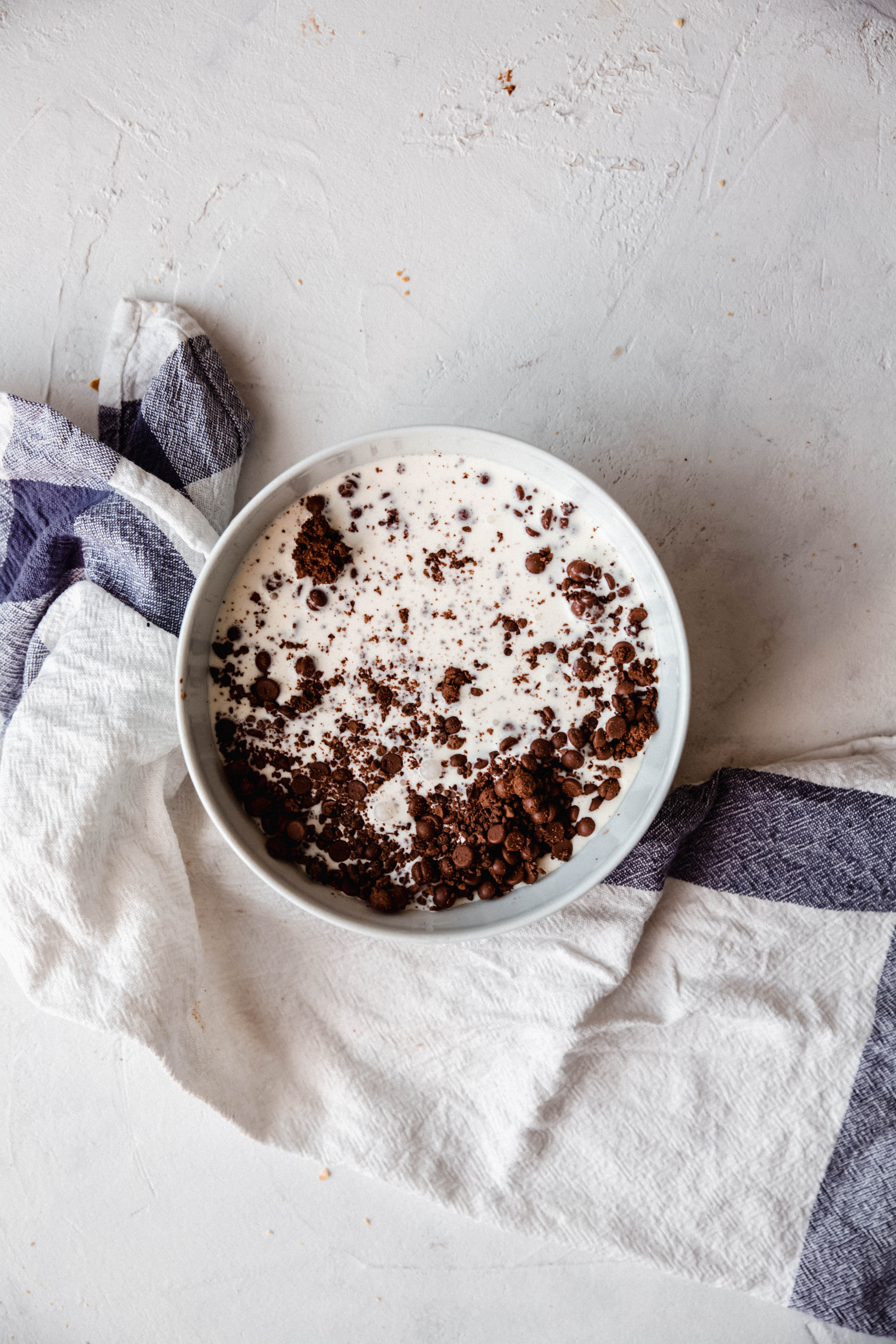 Dans un bol mettre le chocolat et la crème liquide et faire fondre au micro-onde pendant 1 minute 30 ou plus en fonction de votre micro-onde. Ou faites fondre le chocolat dans la crème au bain marie. Le chocolat doit être complètement fondu. Remuez à l’aide d’un fouet de l’intérieur vers l’extérieur. Réservez et laissez refroidir.